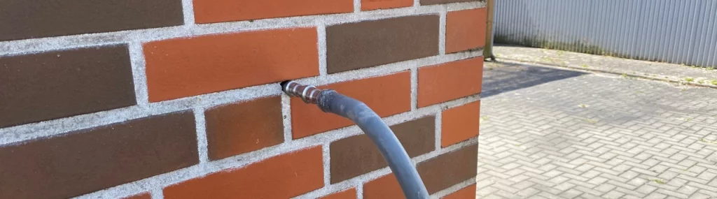 Das hängt von dem Material ab, welches eingebaut werden soll. Aber generell werden, wie oben schon erwähnt, zunächst Löcher in die Außenwand gebohrt. Bei Klinkerfassaden geschieht dies natürlich in den Fugenkreuzen, damit die Steine nicht beschädigt werden und die Löcher so einfacher zu verschließen sind. Beim Dämmschaum Biolan® werden während oder nach Abschließen der Bohrungen Materialproben angefertigt und das Bauprotokoll geschrieben, wodurch ein Zertifikat ermöglicht wird. Anschließend wir die Maschine, die die Komponenten im Anhänger zusammenmischt so eingestellt, dass optimales Material verbaut wird. Nun kommt der Schlauch mit Düse in die Löcher der Fassade und der Hahn wird aufgedreht. Durch Luftdruck wird das Material durch den Schlauch zur Wand befördert. Mithilfe von sogenannten „Peilstäben“ wird geguckt wann der Schaum beim nächsten Loch ankommt, damit eine lückenlose Verfüllung gelingt. Der Peilstab wird in das Loch nebenan geführt bis durch zur Hohlschicht. Drückt sich nun der Schaum gegen den Stab, bewegt sich dieser. Das bedeutet, dass der Schaum den Raum zwischen den Löchern gefüllt hat. Zieht man den Stab nun heraus, wird der Schaum daran zu erkennen sein. Nun wird das nächste Loch angegangen, wobei erst längst der Wand und dann in der nächsten horizontalen Reihe gearbeitet wird, damit die Dämmung den Hohlraum vollkommen ausfüllt. Nach diesem Verfahren wird jede Wand nacheinander abgearbeitet bis jede Fläche bedient wurde. Die Schaumapparatur kann aufgrund des handlichen Aufbaus und der konfortablen Größe von einem Mitarbeiter bedient werden. Der/Die anderen Mitarbeiter bohren währenddessen die Löcher, verfugen diese wieder nach der Dämmung und behalten die Werte im Auge, damit die hohe Qualität des Dämmmaterial stets gewährleistet ist. Nach Abschluss aller Aufgaben wird die „Baustelle“ gereinigt und kritisch überprüft. Denn ein sauberes Hinterlassen eines Projektes gehört zu unserem Standard!